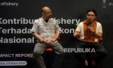 REPUBLIKA.CO.ID,JAKARTA -- CEO eFishery Gibran Huzaifah bersama Wakil Kepala Lembaga Demografi Fakultas Ekonomi dan Bisnis Universitas Indonesia (LD FEB UI) Paksi C.K.Walandouw (kiri) memberikan keterangan terkait kontribusi eFishery terhadap Perekonomian Nasional di Jakarta, Rabu (29/3/2023).