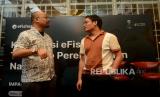 CEO eFishery Gibran Huzaifah (kanan) berbincang bersama Wakil Kepala Lembaga Demografi Fakultas Ekonomi dan Bisnis Universitas Indonesia (LD FEB UI) Paksi C.K.Walandouw (kiri) sebelum memberikan keterangan terkait kontribusi eFishery terhadap Perekonomian Nasional di Jakarta, Rabu (29/3/2023). eFishery yang merupakan perusahaan Aquaculture Intelligence yang mengembangkan inovasi di bidang akuakultur menggandeng LD FEB UI melalui sebuah riset yang memaparkan beberapa temuan penting atas peranan eFishery mulai dari peningkatan pendapatan usaha dan keuntungan para petani melalui produk dan layanan digital hingga peningkatan hasil budidaya panen melalui pengaplikasian teknologi yang lebih efektif dan efisien dalam sektor akuakultur di Indonesia. (FOTO : Republika/Prayogi.)
