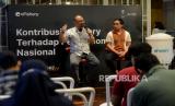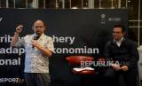 Wakil Kepala Lembaga Demografi Fakultas Ekonomi dan Bisnis Universitas Indonesia (LD FEB UI) Paksi C.K.Walandouw (kiri)memberikan keterangan terkait kontribusi eFishery terhadap Perekonomian Nasional di Jakarta, Rabu (29/3/2023). eFishery yang merupakan perusahaan Aquaculture Intelligence yang mengembangkan inovasi di bidang akuakultur menggandeng LD FEB UI melalui sebuah riset yang memaparkan beberapa temuan penting atas peranan eFishery mulai dari peningkatan pendapatan usaha dan keuntungan para petani melalui produk dan layanan digital hingga peningkatan hasil budidaya panen melalui pengaplikasian teknologi yang lebih efektif dan efisien dalam sektor akuakultur di Indonesia. (FOTO : Republika/Prayogi.)
