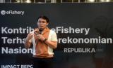CEO eFishery Gibran Huzaifah memberikan keterangan terkait kontribusi eFishery terhadap Perekonomian Nasional di Jakarta, Rabu (29/3/2023). eFishery yang merupakan perusahaan Aquaculture Intelligence yang mengembangkan inovasi di bidang akuakultur menggandeng LD FEB UI melalui sebuah riset yang memaparkan beberapa temuan penting atas peranan eFishery mulai dari peningkatan pendapatan usaha dan keuntungan para petani melalui produk dan layanan digital hingga peningkatan hasil budidaya panen melalui pengaplikasian teknologi yang lebih efektif dan efisien dalam sektor akuakultur di Indonesia. (FOTO : Republika/Prayogi.)