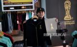 Vokalis grup band D Masiv Rian (kanan) saat memilah merchandise Piala Dunia U-20 di gerai official licensed product World Cup U-20 Indonesia, Juaraga store di FX Sudirman, Jakarta, Kamis (30/3/2023). Perhelatan Piala Dunia U-20 batal digelar di Indonesia, setelah FIFA memutuskan membatalkan Indonesia sebagai tuan rumah FIFA U-20 World Cup 2023. (FOTO : Republika/Thoudy Badai)