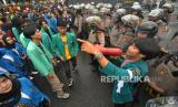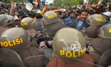 Sejumlah mahasiswa yang tergabung dalam Badan Ekesekutif Mahasiswa (BEM) se-Bengkulu saling dorong dengan anggota polisi saat unjuk rasa penolakan Undang-undang Cipta Kerja di kantor Dewan Perwakilan Rakyat Daerah (DPRD) Provinsi Bengkulu di Kota Bengkulu, Kamis (30/3/2023). Mereka mengecam DPR yang menyetujui Peraturan Pemerintah Pengganti Undang-Undang (Perppu) Nomor 2 Tahun 2022 tentang Cipta Kerja (Ciptaker) menjadi undang-undang (UU) meski sebelumnya dinyatakan inkonstitusional oleh Mahkamah Konstitusi (MK). (FOTO : Antara/Muhammad Izfaldi )
