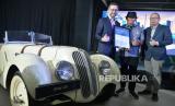 President Director BMW Group Indonesia Ramesh Divyanathan, bersama President Director BMW Ultima Peter Anugrah, menyerahkan sertifikat kepada Chairman BMWCCI classic register Nanan Soekarna (dari kiri) saat peresmian BMW Classic Partner : BMW Ultima di Serpong, Tangerang Selatan, Kamis (30/3/2023). BMW Classic Partner merupakan bengkel yang mendapat sertifikasi dari BMW Group Classic Global untuk restorasi dan perbaikan dengan menggunakan Suku Cadang Asli BMW untuk kendaraan BMW Classic dan menjadi yang pertama dan satu-satunya di Asia.  (FOTO : Republika/Edwin Dwi Putranto)