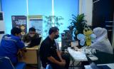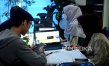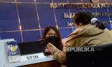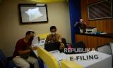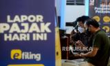 Pegawai membantu Wajib Pajak yang hendak melaporkan Surat Pemberitahuan Tahunan (SPT) Pajak di Kantor Pelayanan Pajak Pratama Jakarta Tanah Abang Tiga, Jumat (31/3/2023). Seluruh warga negara Indonesia yang sudah memiliki nomor pokok wajib pajak diwajibkan untuk melaporkan SPT pajak adapun deadline penyampaian SPT wajib pajak orang pribadi akan berakhir hari ini, Jumat (31/3/2023). Wajib pajak yang belum melaporkan surat pemberitahuan tahunan akan berisiko terkena denda. (FOTO : Republika/Prayogi.)