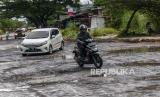 REPUBLIKA.CO.ID,CILEGON -- Pengendara roda dua menghindari jalan berlubang di Jalan Lingkar Selatan, Kota Cilegon, Banten, Sabtu (1/4/2023).