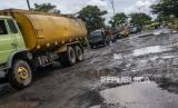 Pengendara roda empat menghindari jalan berlubang di Jalan Lingkar Selatan, Kota Cilegon, Banten, Sabtu (1/4/2023). Jalan utama yang menjadi akses jalur pemudik pengendara motor menuju pelabuhan Ciwandan tersebut kondisinya berlubang dan rusak parah hingga kini belum diperbaiki oleh pemerintah setempat. (FOTO : Antara/Muhammad Bagus Khoirunas)