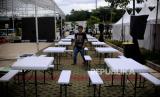 Pedagang menyiapkan stan untuk berjualan di Masjid At Thohir, Depok, Jawa Barat, Sabtu (1/4/2023). Masjid At Thohir menyelenggarakan kegiatan Ramadan bertajuk Khazanah Fest yang menyajikan kajian Islami, stan makanan, tempat berbuka puasa bersama dan UMKM yang berlangsung hingga 16 April 2023. (FOTO : Republika/Putra M. Akbar)