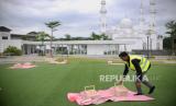 Petugas menyiapkan kain untuk tempat piknik sambil berbuka puasa di Masjid At Thohir, Depok, Jawa Barat, Sabtu (1/4/2023). Masjid At Thohir menyelenggarakan kegiatan Ramadan bertajuk Khazanah Fest yang menyajikan kajian Islami, stan makanan, tempat berbuka puasa bersama dan UMKM yang berlangsung hingga 16 April 2023. (FOTO : Republika/Putra M. Akbar)