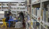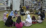 Relawan bersama peserta membaca buku saat Pesantren Kilat Ngabuburit Ceria di Perpustakaan Masjid Pusdai, Kota Bandung, Jawa Barat, Sabtu (1/4/2023). Kegiatan tersebut untuk mengisi waktu bagi anak-anak jelang berbuka puasa dengan kegiatan membaca buku islami, mengaji, dakwah islam, permainan hingga sholat berjamaah. (FOTO : ABDAN SYAKURA/REPUBLIKA)