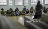 Relawan memberikan materi fikih untuk anak saat Pesantren Kilat Ngabuburit Ceria di Perpustakaan Masjid Pusdai, Kota Bandung, Jawa Barat, Sabtu (1/4/2023). Kegiatan tersebut untuk mengisi waktu bagi anak-anak jelang berbuka puasa dengan kegiatan membaca buku islami, mengaji, dakwah islam, permainan hingga sholat berjamaah. (FOTO : ABDAN SYAKURA/REPUBLIKA)