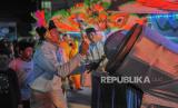 Peserta Festival Arakan Sahur menaiki kendaraan yang dihiasi ornamen Islami saat melewati Jalan Sultan Hasanuddin, Kuala Tungkal, Tanjung Jabung Barat, Jambi, Sabtu (1/4/2023) malam. (FOTO : ANTARA FOTO/Wahdi Septiawan)