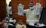 Petugas menunjukan barang sitaan saat konferensi pers pengumuman penahanan tersangka di Gedung Merah Putih KPK, Jakarta, Senin (3/4/2023). KPK resmi melakukan penahanan terhadap tersangka Rafael Alun Trisambodo (RAT) dalam kasus dugaan tindak pidana korupsi dengan menggunakan jabatannya atas penerimaan gratifikasi dari beberapa wajib pajak terkait pengkondisian berbagai temuan pemeriksaan perpajakan di Ditjen Pajak Kemenkeu tahun 2011 hingga 2023. Dalam konferensi pers tersebut, KPK juga berhasil menyita sejumlah tas mewah, perhiasan dan sejumlah mata uang dollar Amerika, dollar Singapura dan mata uang euro senilai Rp32,2 miliar saat melakukan penggeledahan di kediaman RAT. Oleh karena itu, untuk kepentingan penyidikan, KPK melakukan penahanan terhadap RAT selama 20 hari pertama dari tanggal 3-22 April 2023 mendatang di Rutan KPK Gedung Merah Putih. (FOTO : Republika/Thoudy Badai)