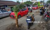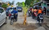 REPUBLIKA.CO.ID,JAMBI -- Pengendara melintasi Jalan DR. Siwabessy yang rusak dan ditanami pohon pisang di Telanaipura, Jambi, Selasa (4/4/2023).