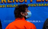 Deteni WNA asal Hungaria, Robert dihadirkan saat konferensi pers penangkapan WNA di Kantor Imigrasi Kelas I TPI Yogyakarta, Rabu (5/4/2023). WNA asal Hungaria, Robert (33) ditangkap oleh petugas Imigrasi Yogyakarta di Siyono, Gunungkidul karena meresahkan masyarakat. Selama di Siyono, Robert tidur di tenda serta gedung serbaguna, dan mengambil barang dagangan warga tanpa membayar. Saat ini Robert ditahan oleh Imigrasi Yogyakarta untuk menunggu proses deportasi. (FOTO : Republika/Wihdan Hidayat)