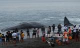 Warga mengamati bangkai Paus Sperma (Physeter macrocephalus) yang terdampar di Pantai Yeh Malet, Karangasem, Bali, Rabu (5/4/2023). (FOTO : ANTARA FOTO/Nyoman Hendra Wibowo)