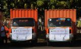Pekerja melintas diantara truk saat pelepasan Penyaluran Program Bantuan Pangan di Komplek Pergudangan Bulog Kelapa Gading, Jakarta, Kamis (6/4/2023). Perum Bulog resmi melepaskan penyaluran Cadangan Beras Pemerintah (CBP) untuk bantuan pangan sebanyak 640.590 ton untuk 21,3 juta keluarga penerima manfaat (KPM) yang tercatat dalam data Kementerian Sosial.Bantuan sosial (bansos) ini untuk mengurangi beban pengeluaran keluarga Penerima Manfaat dalam pemenuhan pangan terutama saat menghadapi Ramadhan dan persiapan Idul Fitri 2023. (FOTO : Tahta Aidilla/Republika)
