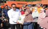 Direktur Utama Perum Bulog Budi Waseso menyerahkan beras kepada perwakilan Keluarga Penerima Manfaat (KPM) saat Penyaluran Program Bantuan Pangan di Komplek Pergudangan Bulog Kelapa Gading, Jakarta, Kamis (6/4/2023). Perum Bulog resmi melepaskan penyaluran Cadangan Beras Pemerintah (CBP) untuk bantuan pangan sebanyak 640.590 ton untuk 21,3 juta keluarga penerima manfaat (KPM) yang tercatat dalam data Kementerian Sosial.Bantuan sosial (bansos) ini untuk mengurangi beban pengeluaran keluarga Penerima Manfaat dalam pemenuhan pangan terutama saat menghadapi Ramadhan dan persiapan Idul Fitri 2023. (FOTO : Tahta Aidilla/Republika)