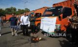 Direktur Utama Perum Bulog Budi Waseso (kedua kiri) didampingi Kepala Badan Pangan Nasional Arief Prasetyo Adi (kanan) dan Direktur Utama PT Pos Indonesia Faizal Rochmad Djoemadi (kiri) ) melepas keberangkatan truk yang akan menyalurkan cadangan beras pemerintah saat Penyaluran Program Bantuan Pangan di Komplek Pergudangan Bulog Kelapa Gading, Jakarta, Kamis (6/4/2023). Perum Bulog resmi melepaskan penyaluran Cadangan Beras Pemerintah (CBP) untuk bantuan pangan sebanyak 640.590 ton untuk 21,3 juta keluarga penerima manfaat (KPM) yang tercatat dalam data Kementerian Sosial.Bantuan sosial (bansos) ini untuk mengurangi beban pengeluaran keluarga Penerima Manfaat dalam pemenuhan pangan terutama saat menghadapi Ramadhan dan persiapan Idul Fitri 2023. (FOTO : Tahta Aidilla/Republika)
