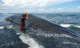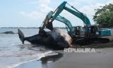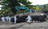 REPUBLIKA.CO.ID, KARANGASEM -- Dokter hewan melakukan pengukuran panjang tubuh bangkai paus sperma di Pantai Yeh Malet, Karangasem, Bali, Kamis (6/4/2023). Kepala Balai Pengelolaan Sumberdaya Pesisir dan Laut Denpasar Permana Yudiarso mengatakan paus sperma berukuran panjang 18,2 meter dan lingkar badan 8 meter tersebut sebelum dikubur dilakukan nekropsi atau kegiatan bedah bangkai hewan untuk mengetahui penyebab kematian mamalia laut itu.