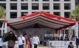 Sejumlah pengunjung berjalan di dekat panggung acara pembukaan Republika Ramadhan Festival 2023 di Masjid Istiqlal, Jakarta, Jumat (7/4/2023). Republika Ramadhan Festival 2023 bertajuk Gaya Hidup Halal untuk Kebangkitan Ekonomi dengan pembahasan seputar ekonomi syariah dan gaya hidup halal dengan harapan dapat menggerakan perekonomian melalui ekonomi syariah. Acara tersebut menghadirkan serangkaian kegiatan seperti talkshow, kajian keislaman, bazar, santunan hingga hiburan tersebut berlangsung hingga Sabtu (15/4/2023). (FOTO : Republika/Putra M. Akbar)