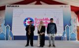 Pemimpin Republika Irfan Junaidi (kanan) bersama Ketua Umum Badan Kontak Majelis Taklim (BKMT) Syifa Fauzia (tengah) dan Direktur Pemberdayaan Zakat dan Wakaf Ditjen Bimas Islam Kemenag Tarmizi Tohor (kiri) berfoto bersama saat membuka acara Republika Ramadhan Festival di Plaza Al-Fatah Masjid Istiqlal, Jakarta, Jumat (7/4/2023). Republika Ramadhan Festival 2023 bertajuk Gaya Hidup Halal untuk Kebangkitan Ekonomi dengan pembahasan seputar ekonomi syariah dan gaya hidup halal dengan harapan dapat menggerakan perekonomian melalui ekonomi syariah. Acara tersebut menghadirkan serangkaian kegiatan seperti bazar, talkshow, kajian keislaman, santunan hingga hiburan tersebut berlangsung hingga Sabtu (15/4/2023). (FOTO : Republika/Thoudy Badai)