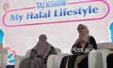 Founder Halal Corner, Aisha Maharani (kiri) dan Research and Development Head Martha Tilaar Group, Maily (kanan) saat memaparkan materi pada sesi talkshow Republika Ramadhan Festival di Plaza Al-Fatah Masjid Istiqlal, Jakarta, Jumat (7/4/2023). (FOTO : Republika/Thoudy Badai)