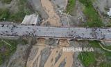 Foto udara kondisi jembatan yang amblas akibat hujan di Kelurahan Buluri di Palu, Sulawesi Tengah, Jumat (7/4/2023). (FOTO : ANTARA FOTO/Mohamad Hamzah)