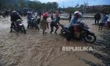 REPUBLIKA.CO.ID, PALU -- Pengendara melintasi sungai akibat jembatan amblas dan tidak dapat dilalui di Kelurahan Buluri di Palu, Sulawesi Tengah, Jumat (7/4/2023).