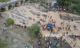 Foto udara pengendara melintasi sungai akibat jembatan amblas dan tidak dapat dilalui di Kelurahan Buluri di Palu, Sulawesi Tengah, Jumat (7/4/2023). (FOTO : ANTARA FOTO/Mohamad Hamzah)