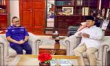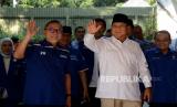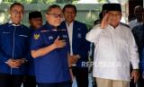 Ketua Umum Partai Gerindra Prabowo Subianto bersama Ketua Umum Partai Amanat Nasional (PAN) Zulkifli Hasan menyapa wartawan sebelum melakukan pertemuan di Kertanegara, Jakarta, Sabtu (8/4/2023). Pertemuan tersebut selain sebagai ajang silaturahmi juga untuk membahas rencana pembentukan koalisi besar (FOTO : Dok Republika )