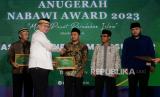 Ketua Umum ICMI Arif Satria memberikan penghargaan Nabawi Award dalam acara Republika Ramadhan Festival Semarak Ramadhan ICMI di Masjid Istiqlal, Jakata, Sabtu (8/4/2023). (FOTO : Republika/Prayogi)