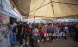 Sejumlah calon penumpang kapal antre di loket tempat penukaran tiket di Pelabuhan Batu Ampar, Batam, Kepulauan Riau, Ahad (9/4/2023). PT Pelayaran Nasional Indonesia (Pelni) cabang Batam menyebutkan tiket kapal laut tujuan Belawan, Sumatra Utara untuk keberangkatan tanggal 17, 18 dan 19 April 2023 sudah habis terjual karena banyak warga yang ingin mudik Lebaran. ANTARA FOTO/Teguh Prihatna/foc. (FOTO : Antara/Teguh Prihatna)