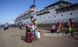 Sejumlah penumpang turun dari KM Kelud yang baru bersandar di Pelabuhan Batu Ampar, Batam, Kepulauan Riau, Ahad (9/4/2023). PT Pelayaran Nasional Indonesia (Pelni) cabang Batam menyebutkan tiket kapal laut tujuan Belawan, Sumatera Utara untuk keberangkatan tanggal 17, 18 dan 19 April 2023 sudah habis terjual karena banyak warga yang ingin mudik Lebaran. (FOTO : Antara/Teguh Prihatna)