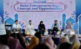Deputi Direktur Departemen Ekonomi dan Keuangan Syariah Bank Indonesia, M Irfan Sukarna, CEO Shabu Hatchi, Githa Nafeeza, Owner Tuneeca, Samira M Bafagih dan Kepala Badan Penyelenggara Jaminan Produk Halal (BPJPH), M Aqil Irham (kiri-kanan) saat sesi talkshow Republika Ramadhan Festival di Masjid Istiqlal, Jakarta, Ahad (9/4/2023). Talkshow tersebut mengangkat tema Halal Enterpreneurship, Concept and Opportunities yang membahas tentang kondisi industri halal di Indonesia dan langkah BPJPH dalam menjangkau masyarakat untuk memahami sertifikasi halal. Selain itu, Acara tersebut menghadirkan serangkaian kegiatan seperti bazar buku, kajian keislaman, santunan hingga hiburan dan berlangsung hingga Sabtu (15/4/2023). (FOTO : Republika/Thoudy Badai)
