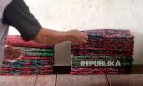 Pekerja melipat sarung goyor yang sudah jadi di rumah produksi sarung goyor cap Botol Terbang, Magelang, Jawa Tengah, Senin (10/4/2023). (FOTO : Republika/Wihdan Hidayat)