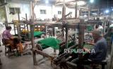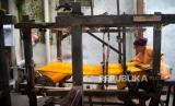 Pekerja membuat sarung goyor dengan Alat Tenun Bukan Mesin (ATBM) di rumah produksi sarung goyor cap Botol Terbang, Magelang, Jawa Tengah, Senin (10/4/2023). (FOTO : Republika/Wihdan Hidayat)