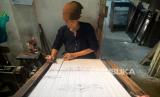 Pekerja membuat pola sarung goyor sebelum ditenun dengan Alat Tenun Bukan Mesin (ATBM) di rumah produksi sarung goyor cap Botol Terbang, Magelang, Jawa Tengah, Senin (10/4/2023). (FOTO : Republika/Wihdan Hidayat)