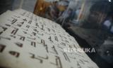 Pengunjung melihat mushaf Alquran tertua di dunia (replika mushaf Tashkent) yang dipamerkan di kantor Kementerian Agama, Jakarta, Selasa (11/4/2023). (FOTO : Republika/Putra M. Akbar)