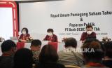 Direktur Utama Bank OCBC NISP Parwati Surjaudaja (tengah) berbincang dengan Direktur Bank OCBC NISP, Hartati (kiri), Direktur Bank OCBC NISP, Bapak Martin Widjaja (kanan) berbicara saat Paparan Publik Rapat Umum Pemegang Saham Tahunan (RUPST) Bank OCBC NISP 2023 di Jakarta, Selasa (11/4/2023). (FOTO : Republika/ Tahta Aidilla)