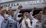 Mantan Ketua Umum Partai Demokrat Anas Urbaningrum menyapa kerabat dan simpatisan usai bebas dari Lapas Kelas 1 Sukamiskin, Jalan A.H. Nasution, Arcamanik, Kota Bandung, Selasa (11/4/2023). (FOTO : ABDAN SYAKURA/REPUBLIKA)