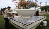 Relawan Masjid Raya Baiturrahman menyiapkan hidangan minuman dan makanan untuk jamaah masjid untuk berbuka puasa di Masjid Raya Baiturrahman, Banda Aceh,Senin (10/4/2023).  (FOTO : EPA-EFE/HOTLI SIMANJUNTAK)