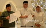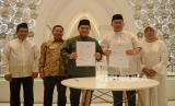 Ketua umum ICMI Arif Satria bersama Ketua umum Masyarakat Ekonomi Syariah (MES) Erick Thohir menunjukan nota Penandatanganan Kerjasama di Masjid At Thohir, Tapos, Depok, Jawa Barat, Selasa (11/04/2023). ICMI bersama MES secara resmi meluncurkan platform digital Amalbox, Yakni sebuah platform yang memungkinkan masyarakat Indonesia beramal termasuk untuk memberikan bantuan kemanusian. (FOTO : Republika/Prayogi)