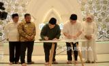 Ketua umum ICMI Arif Satria bersama Ketua umum Masyarakat Ekonomi Syariah (MES) Erick Thohir melakukan Penandatanganan Kerjasama di Masjid At Thohir, Tapos, Depok, Jawa Barat, Selasa (11/04/2023). ICMI bersama MES secara resmi meluncurkan platform digital Amalbox, Yakni sebuah platform yang memungkinkan masyarakat Indonesia beramal termasuk untuk memberikan bantuan kemanusian. (FOTO : Republika/Prayogi)