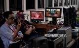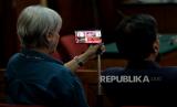 Operator stasiun televisi menyimak pembacaan analisa fakta yuridis saat sidang putusan banding di Pengadilan Tinggi DKI Jakarta, Rabu (12/4/2023). (FOTO : Republika/Thoudy Badai)