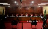 REPUBLIKA.CO.ID, JAKARTA -- Hakim Ketua Singgih Budi Prakoso bersama hakim anggota lainnya saat membacakan analisa fakta yuridis saat sidang putusan banding Terdakwa Ferdy Sambo di Pengadilan Tinggi DKI Jakarta, Rabu (12/4/2023).