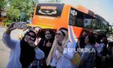 Pemudik berswafoto sebelum menaiki bus di Terminal Kampung Rambutan, Jakarta, Rabu (12/4/2023). Terminal Kampung Rambutan mulai ramai didatangi oleh pemudik tujuan Pulau Sumatera yang memilih untuk mudik lebih dahulu. Hal tersebut dikarenakan menghindari kenaikan tarif tiket bus lintas Sumatera sebesar 50 hingga 60 persen yang akan berlaku pada 14 Maret 2023 dan untuk menghindari penumpukan penumpang bus di Pelabuhan Merak saat puncak arus mudik. (FOTO : Republika/Putra M. Akbar)