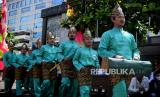 Sejumlah peserta memberikan salam sebelum tampil pada Festival Bedug di Kantor Wali Kota Jakarta Pusat, Jakarta, Rabu (12/4/2023). Festival Bedug untuk melestarikan budaya Betawi dan syiar Islam tersebut diikuti oleh 16 peserta dari 8 kecamatan di wilayah Jakarta Pusat, yang diselenggarakan hingga Kamis (13/4/2023). (FOTO : Republika/Putra M. Akbar)