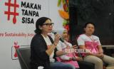 Head of Group Strategic Marketing and Communications PT Bank DBS Indonesia Mona Monika, Subkoordinator Urusan Pengelolaan Sampah Dinas Lingkungan Hidup Provinsi DKI Jakarta Rita Ningsih dan Founder & CEO Jangjo Joe Hansen (dari kiri) berbiicara saat kolaborasi Bank DBS Indonesia dengan Jangjo di Jakarta, Rabu (12/4/2023). (FOTO : Tahta Aidilla/Republika)