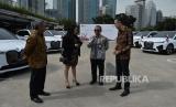 Sekretaris Kementerian Sekretariat Negara (Kemensetneg) Setya Utama (kedua kanan), bersama President Director of BMW Group Indonesia Ramesh Divyanathan (kanan) dan Director of Communication BMW Group Indonesia Jodie O Tania (kedua kiri) saat acara serah terima mobil resmi KTT ASEAN BMW iX di Jakarta, Kamis (13/4/2023). BMW menyerahkan 13 kendaraan listrik premium BMW iX kepada Kemensetneg untuk digunakan oleh presiden maupun perdana menteri negara peserta KTT ASEAN ke-42 di Labuan Bajo, NTT, 9-11 Mei 2023. (FOTO : Republika/Edwin Dwi Putranto)