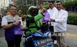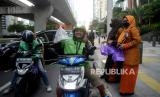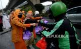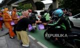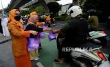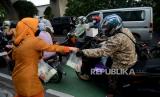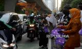 Karyawan Bank Muamalat membagikan takjil kepada masyarakat di depan Muamalat Tower, Jakarta, Kamis (13/4/2023). Bank Muamalat berkolaborasi dengan BMM mengadakan program Muamalat Berbagi dengan membagikan takjil gratis sebagai wujud komitmen perusahaan untuk membantu masyarakat di bulan Ramadan. Sebagian dana dari program ini berasal dari partisipasi nasabah Bank Muamalat yang bersedekah melalui aplikasi mobile banking Muamalat DIN. (FOTO : Republika/Prayogi)